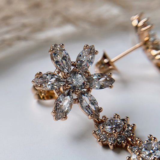 Auksuoti gėlių formos auskarai su spindinčiais cirkoniais