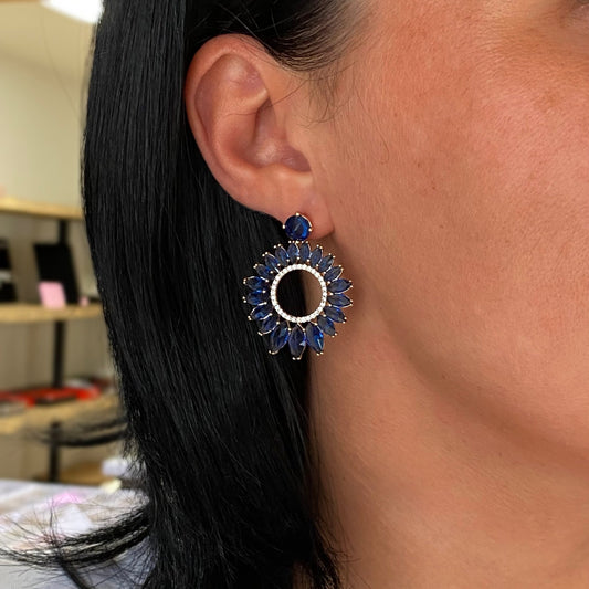 Išraiškingi gėlių auskarai su mėlynais kristalais
