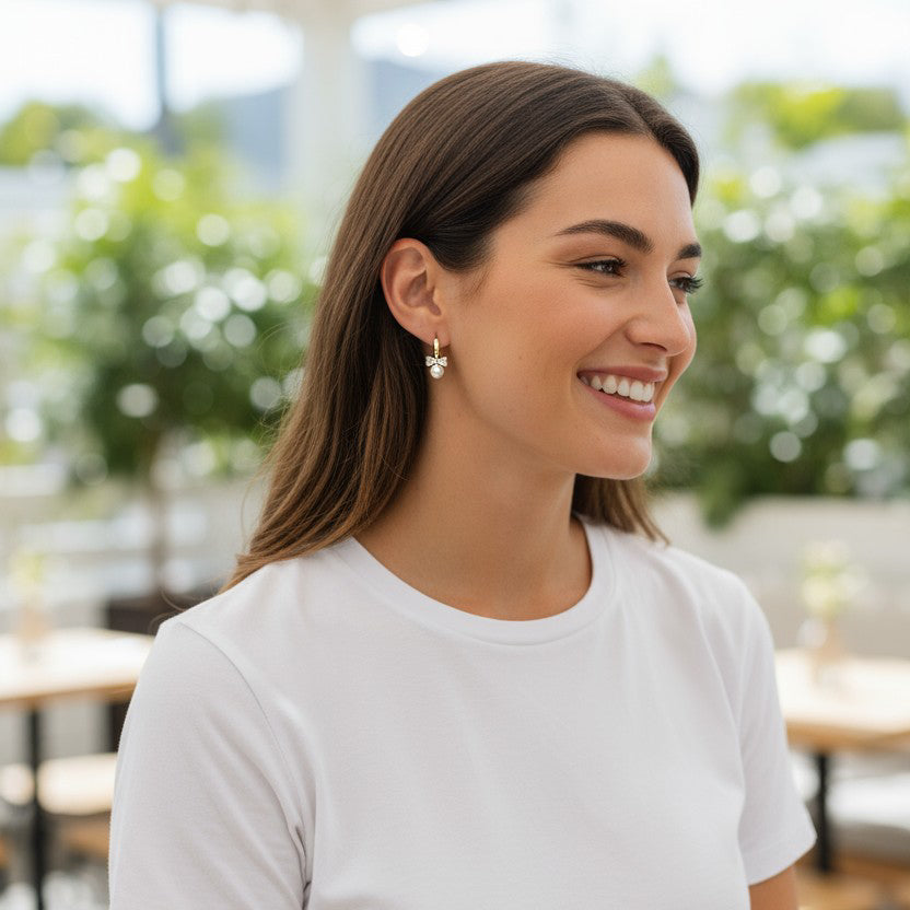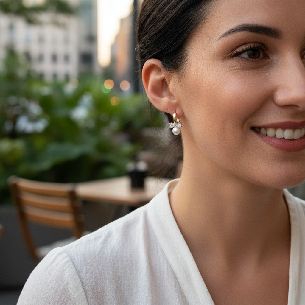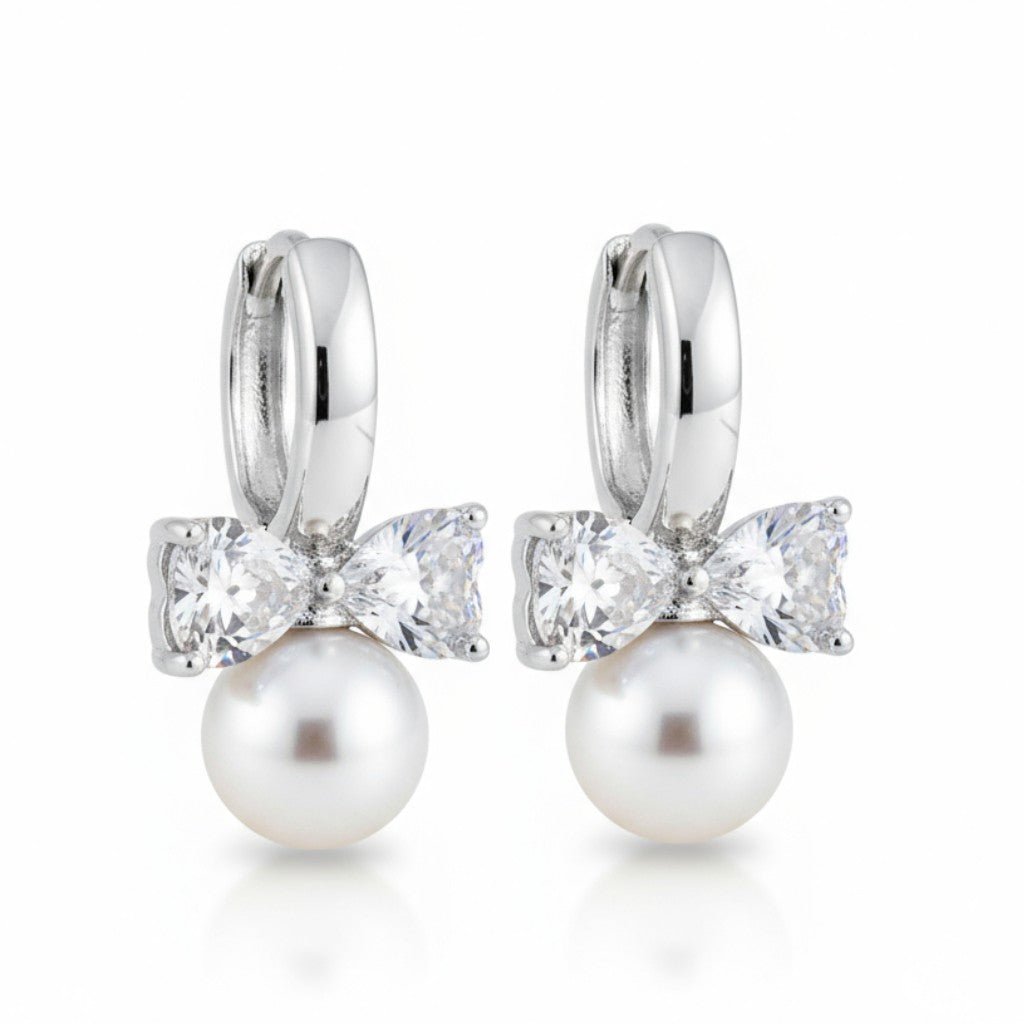 Rafinuoti žiediniai auskarai, kuriuose dera klasikinė perlo elegancija ir žėrintis cirkonio oksidu puoštas kaspinas.