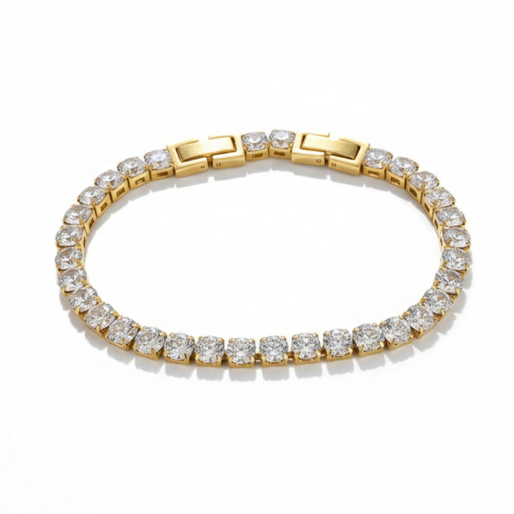 Izsmalcināta rokassprādze, kas apvieno eleganci un izturību. Izgatavota no augstas kvalitātes nerūsējošā tērauda ar apzeltītu pārklājumu un dzirkstošiem kristāliem, kas skaisti atstaro gaismu.